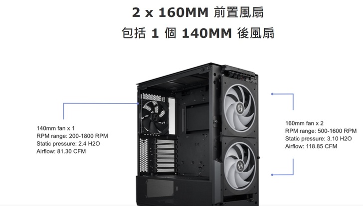 ▼這次LANCOOL 216有許多商品設計值得推薦給玩家,首先LANCOOL 216最吸引我的亮點便是外觀相當簡約大方,前置配備2個160 PWM 風扇和後置1個140mm PWM風扇的設計,讓內部進風量的散熱性相當足夠,有效促成進氣與排氣的平衡。