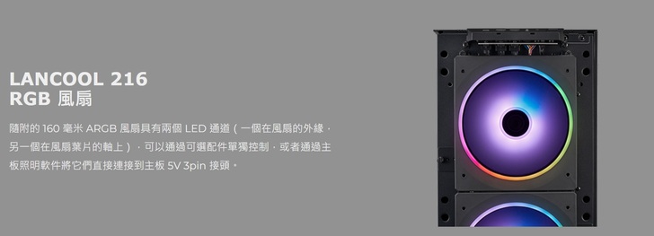 ▼LANCOOL 216機殼內部隨附2顆ARGB風扇,可使用聯力官方的風扇控制軟體來調整自己喜愛的燈效顏色。