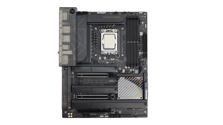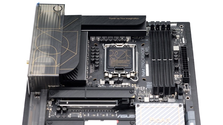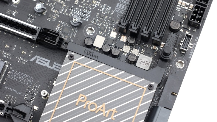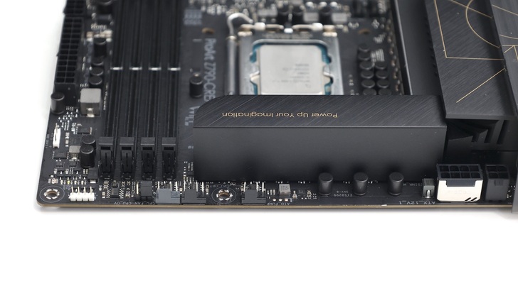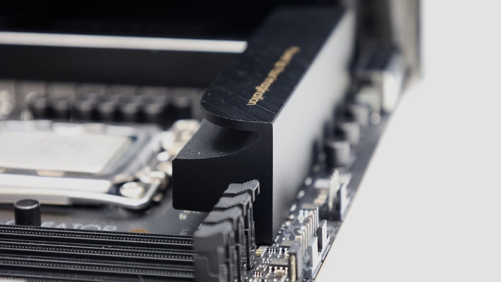 相較電競取向的主機板會在散熱片上有很多花樣和剖溝,ProArt 低調的設計格外凸顯品牌特色。頂部 VRM 上方部分也是全平面的設計,不管是拿主機板還是安裝時,都比較不會勾到東西、刮到手。上面印有 ProArt 的 Slogan,Power Up Your Imagination,其位置也從原本的左上角移到右上角。