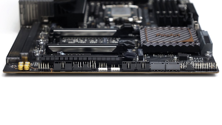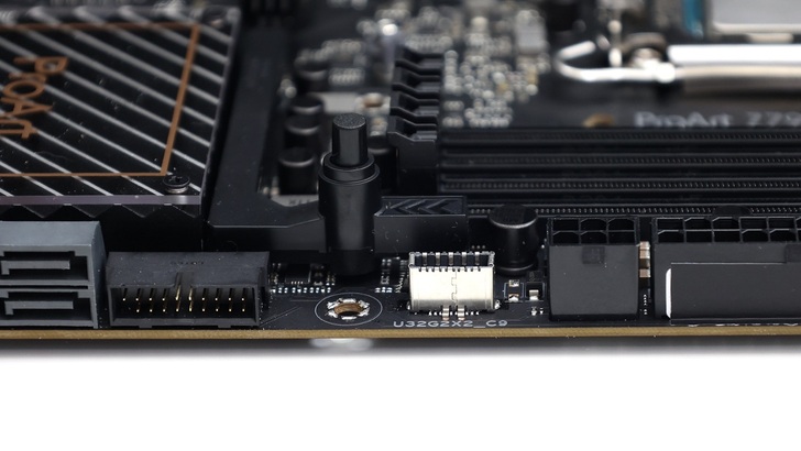後 I/O 採用一體式設計,數量和排列與上一代完全相同,如果兩張主機板放在一起,我應該是分不出來差異。I/O 上提供的 Thunderbolt 和 10GbE,完全是 Creator 需要的 I/O。不過站在一個創作者的角度,我認為目前只有兩個 USB-C,皆為支援 Thunderbolt 其實不太夠,畢竟這兩個 USB-C 其實只是共用一個 PCIe Gen3 x4 的頻寬。若有更多 USB-C 外接 SSD 要同時使用,目前後 I/O USB 全部都是 USB-A,就一定要尋找支援 USB3.2 x2 10Gbps 規格的 USB-C to USB-A 線,才能避免與 Thunderbolt 直接搶頻寬。且 Intel 陣營在高階晶片組給的 DMI4.0 x8 相對足夠,相對隔壁 X670E 是 PCIe Gen4 x4,是更有條件這樣做。以我個人的使用情況,USB-C to USB-C 的普及比 USB-C to USB-A 好很多,因此我認為提供更多 USB-C 才能解決我在實際使用的不便。