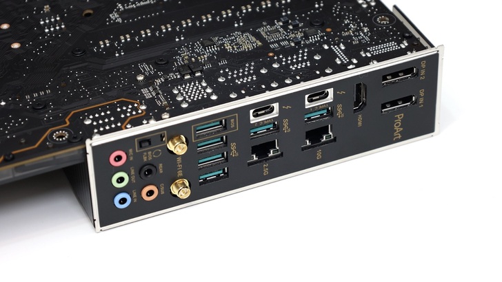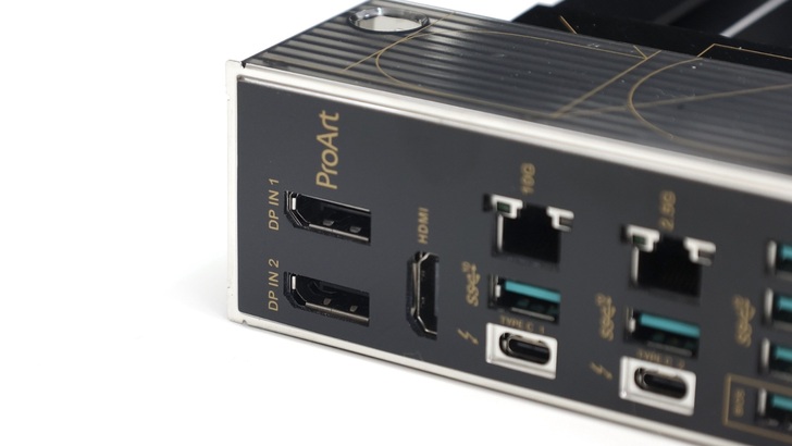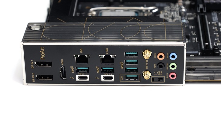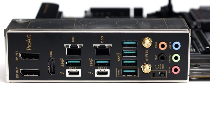 影像輸出有一個 HDMI 支援 HDMI2.1 4K 60Hz 輸出。兩個 USB-C Thunderbolt 4,亦同時支援 USB4。總共六個 USB-A,皆為 USB3.2 Gen2 10Gbps 規格,其中一個支援 BIOS FlashBack,並有一個 BIOS FLBK 按鍵。兩個 RJ-45,分別支援 10GbE 和 2.5GbE,也可以透過燈號辨識連接速度。