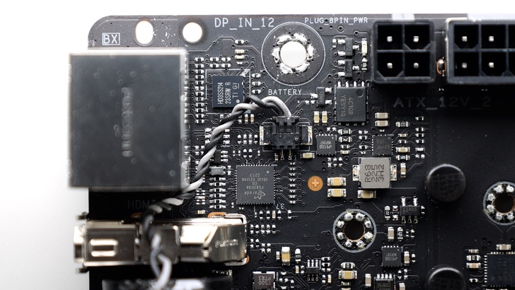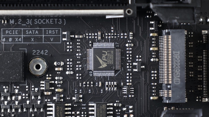 在 PCH 下方有兩顆 ASMedia ASM2480B,為 PCIe Gen4 Switch,其中一顆看路線,應該是與 SATA 和 M.2_4 頻寬切換有關。