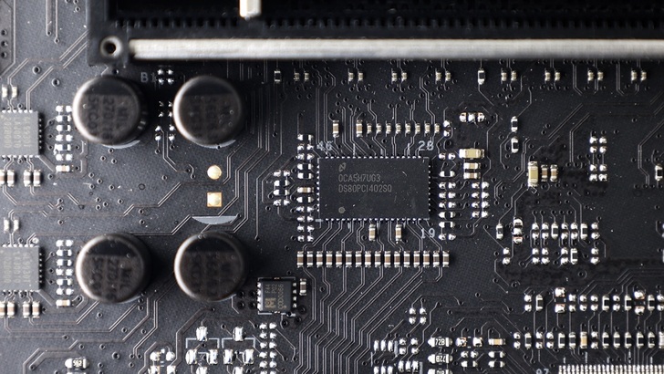 在第一條 PCIe x16 下方,有一顆 Texas Instruments 的 DS80PCI402,功能為 PCIe Gen3 x4 Redriver。