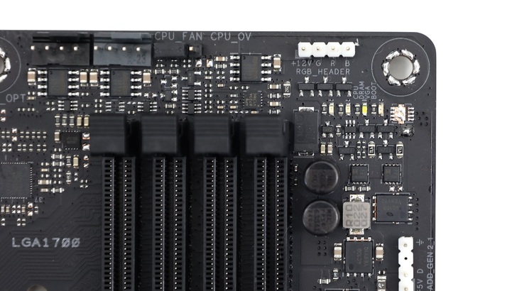 主機板右上方有 debug LD 燈,以橫向排列。頂部有一個 AIO_Pump 接頭,兩個 CPU_Fan,中間有兩個 CHA_Fan,下排有三個 CHA_Fan。不管是 5V 3pin ARGB,還是 12V 4pin RGB 都有支援。