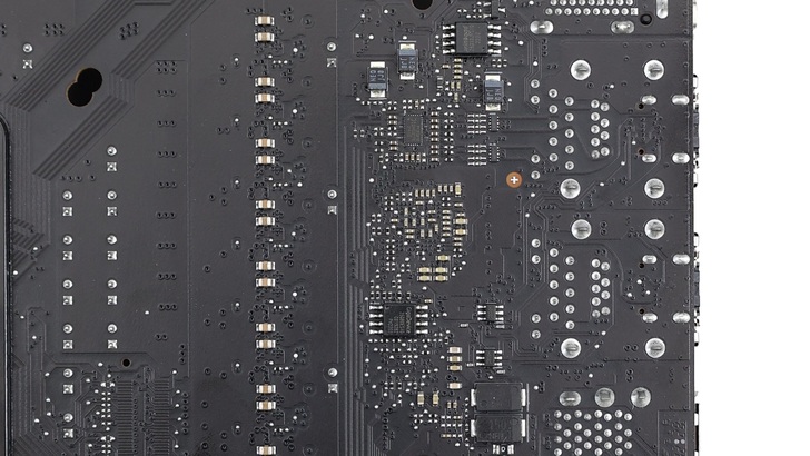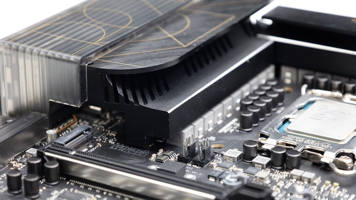 散熱片採用鋁擠型工藝,沒有太多剖溝和線條,因此整張主機板重量滿重的。頂部 VRM 散熱片,相較上一代在尾部採用斜切角的設計,這次也轉為圓弧,與整體內圓角的元素呼應。頂面表面也從原本的洞洞孔改為與左側 VRM 相同方向的細髮絲紋。