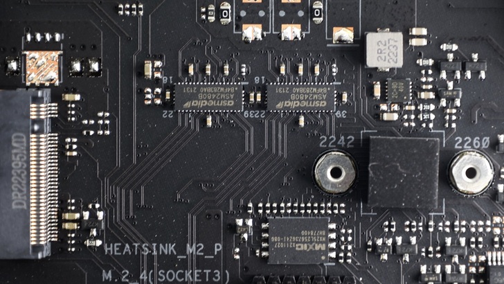M.2_2 在 PCH 下,最高支援 PCIe Gen4 x4,長度支援 2280。M.2_3 在 PCH 下,最高支援 PCIe Gen4 x4,長度支援 22110。M.2_4 在 PCH 下,最高支援 PCIe Gen4 x4 或 SATA 協議,長度支援 22180。每個 M.2 安裝位置都有 Q-Latch 設計,對於使用者安裝、未來升級 SSD 都是莫大福音。
