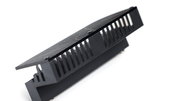 左邊 VRM 散熱除了上半部有剖溝,下半部是實心的,因此有一定重量。邊緣有 45 度倒角,剖溝從正上方也不容易看到。表面有髮絲紋以及 ProArt Logo 線條。
