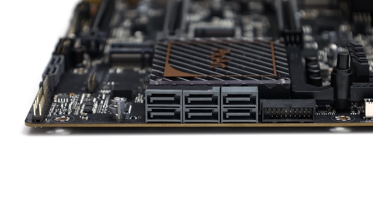 右側有六個 SATA 6Gb/s,下方還有兩個 SATA 6Gb/s,總共八個。其中 SATA6G_5~8 與 M.2_4 共用頻寬,須擇一使用。當 M.2_4 安裝 PCIe 或 SATA 裝置時,SATA6G_5~8 就無法使用。