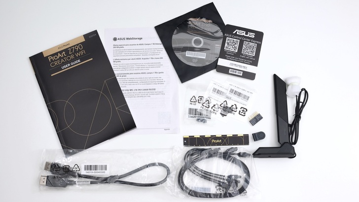 配件包括說明書、光碟、螺絲孔橡膠蓋、Q-Connector、Wi-Fi 天線、M.2 SSD Q-Latch、ProArt 尺、DisplayPort 線、SATS 6Gb/s 線四條。其中 ProArt 尺應該是這次新加入的,不記得以前有看過。此外 Wi-Fi 天線與 TUF GAMING 系列應該是一樣的。