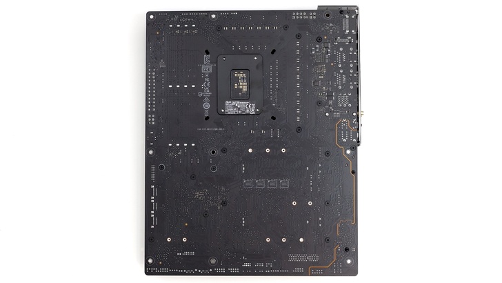 ProArt Z790-Creator WiFi 背面。整體佈局基本與同價位的 ROG 看起來是比較相近,不過沒有 ROG STRIX Z790-F GAMING WIFI 或 ROG STRIX Z790-E GAMING WIFI 背面的圖騰,顯得比較樸實整齊。