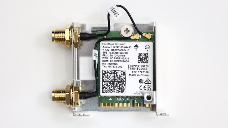 拆開無線網路金屬罩,其採用 Intel AX210NGW,支援 2x2 天線,2.4GHz、5GHz 和 6GHz 的頻段,並支援 160MHz 頻寬,藍牙支援 Bluetooth 5.3。