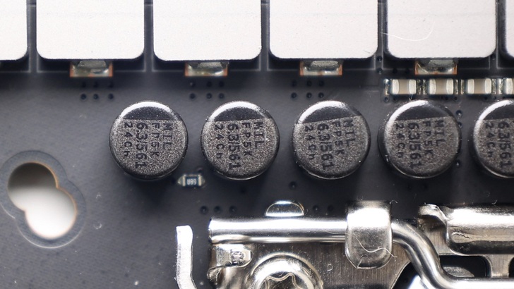 側邊 VRM 散熱片,採用上下兩件方式,中間以螺絲連接。從側邊角度可以看到有許多剖溝,但從正面就只會看到一點點外露。螺絲部分則因為 I/O 塑膠遮罩,所以也看不到。