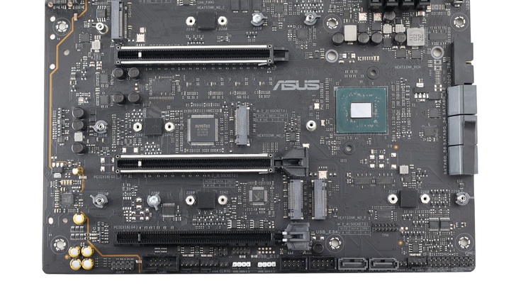 下半部拆掉所有散熱片後的樣貌,也可以看到完整的三條 PCIe x16 和四條 M.2 slot。