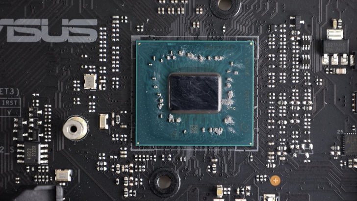 PCH 為 Intel Z790 晶片組 SRM8P,導熱貼片為比較膏狀的型態。目前 Intel 高階晶片組與 CPU 之間的通道為 DMI4.0 x8,相當於 PCIe Gen4 x8。相較於 AMD X670E 的 PCIe Gen4 x4,是兩倍的頻寬。對於有大量同時傳輸需求的使用者來說格外有用。
