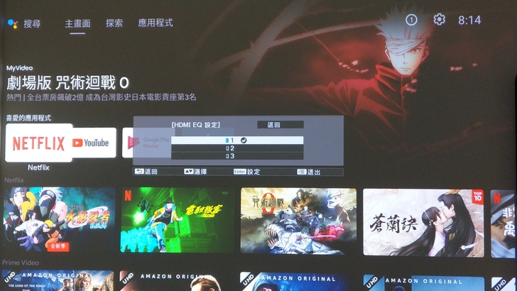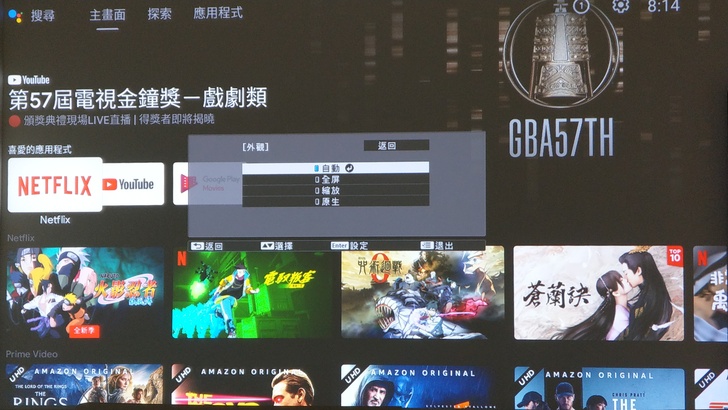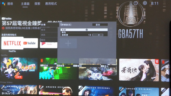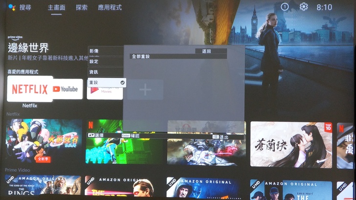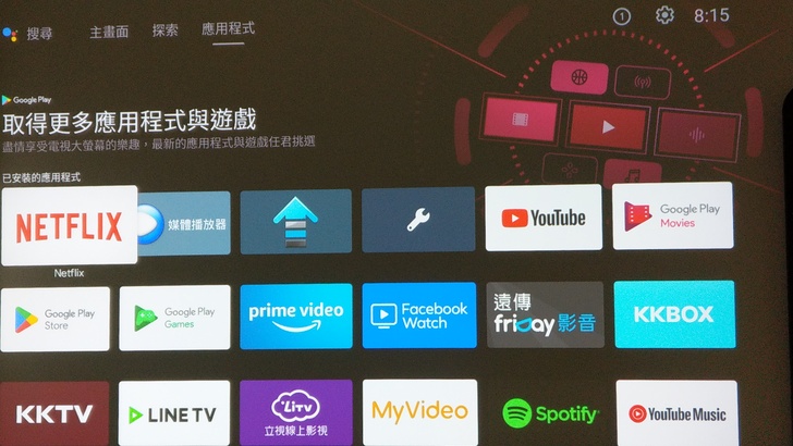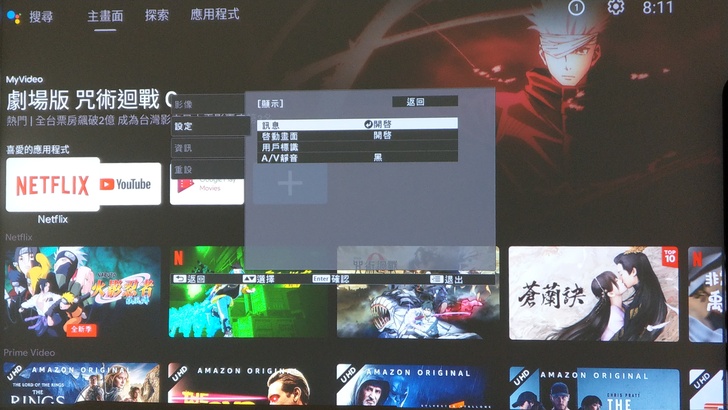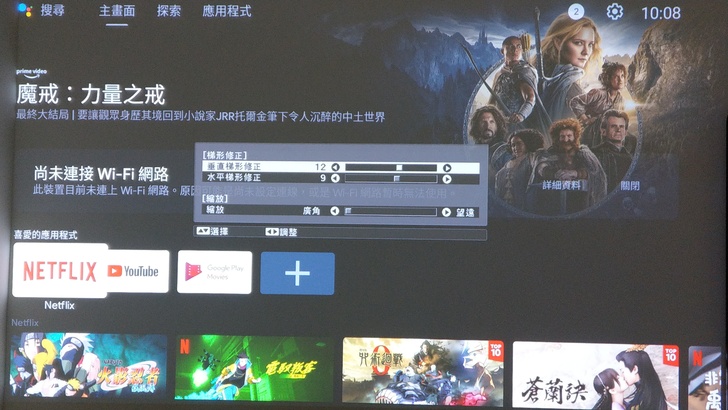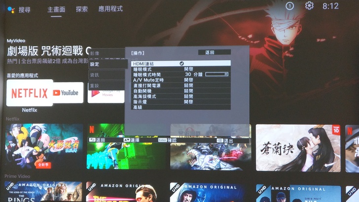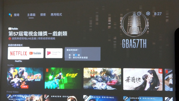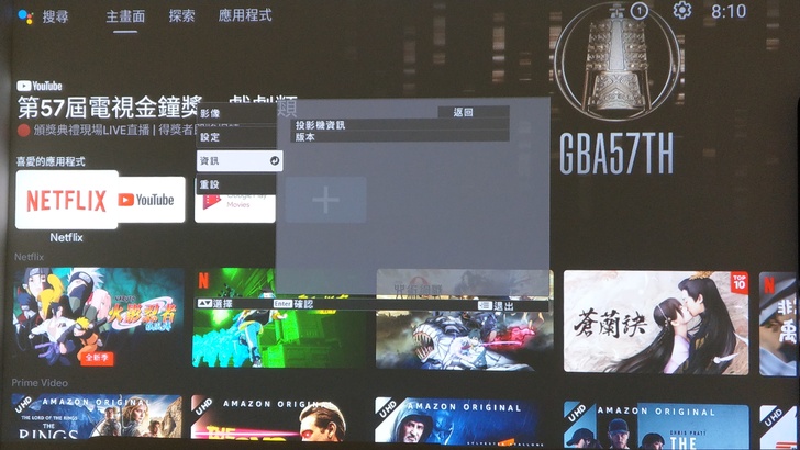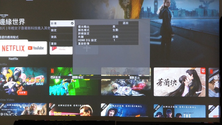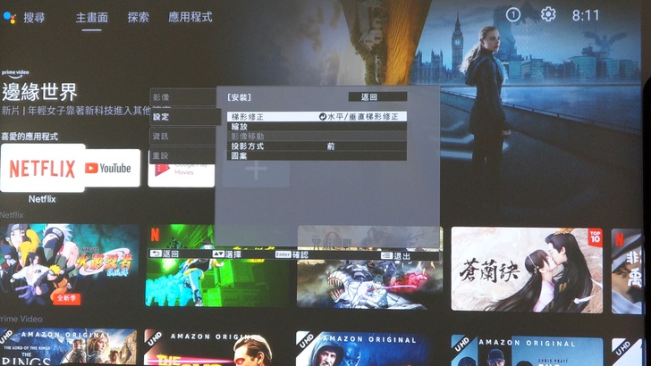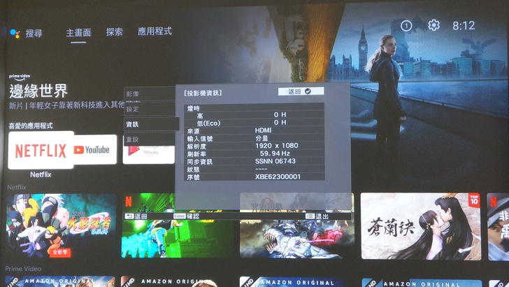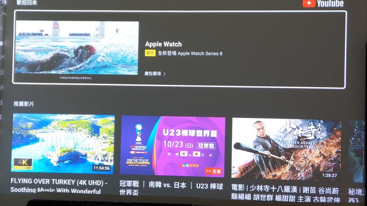 首先進行開燈情境下的測試,因為『Epson 住商兩用高亮彩智慧投影機CO-FH02』機器本身內部就接上Android TV 電視棒,所以,預設開機會直接進入影視娛樂系統,而且預載 Netflix、YouTube 等影音串流平台, 開機就可以和家人享受娛樂時光!