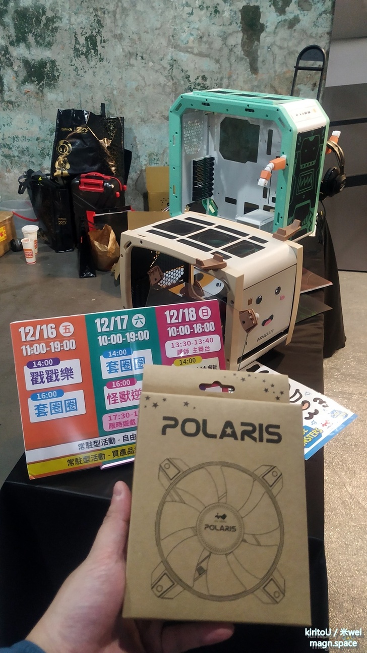 第一天現場人也是不少,現場有多間學校的學生來參觀,同時也有一樣的參觀證,於是隨機找了位學生問才知道,原來是受邀的學校系上學生們,受邀的學生們一樣也有巡禮資格,在準備開始闖關拿各家廠商的禮品時就遇到了小問題,這次入場沒有像以往有發購物袋,這時在大會服務台旁的InWin - Jerry就提供了超精美的購物袋,那購物袋就像是InWin家的機殼一樣的驚艷,雖然本來就是InWin機殼的粉絲,經過第一天一開始Jerry的熱誠,這三天我時不時都就來InWin這報到,玩遍各種小遊戲,雖然每天的出示參觀證送Polars風扇都沒拿到,但InWin各時段的小遊戲,最後還是有拿到風扇回家。