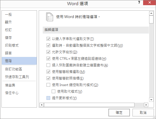 2.在Word選項視窗中,點選“進階”,然後取消“使用智慧段落選取”複選框的勾選,單擊“確定”按鈕。