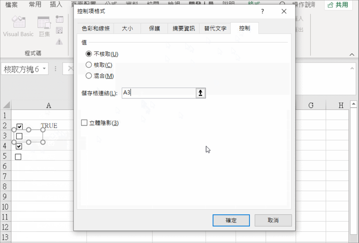 用同樣的方法,分別在4~6行插入複選框,並分別鏈接A3、A4、A5單元格。當點擊複選框後,在對應的A列會輸入TRUE,去掉勾選則輸入FALSE。