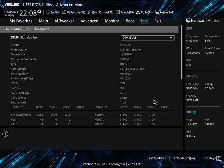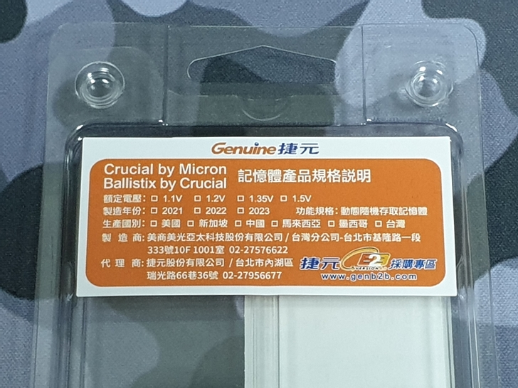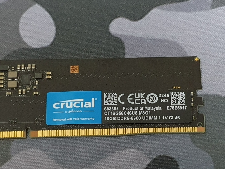 ▼產品貼紙上清楚標示出生產週期為2022年第46週,產地為馬來西亞,型號為CT16G56C46U5.M8G1,容量為16GB的 DDR5-5600 UDIMM 電壓1.1V 時序CL46。