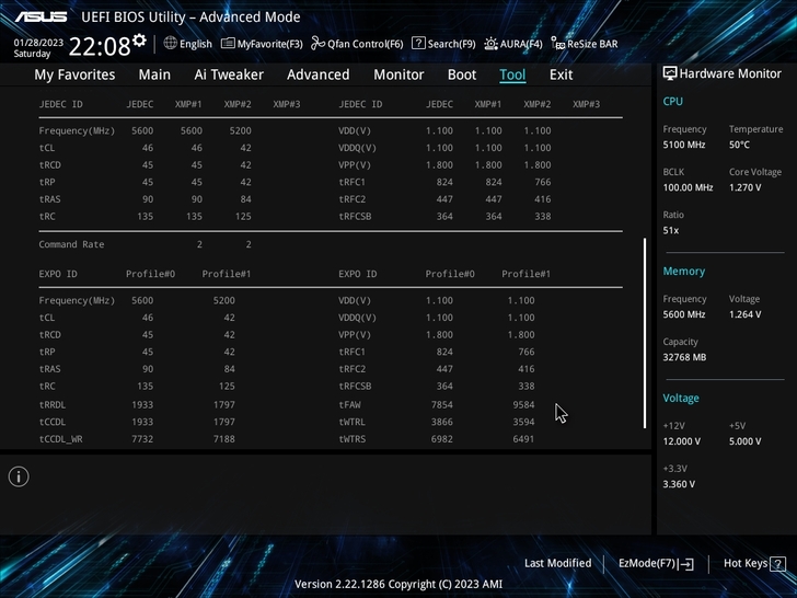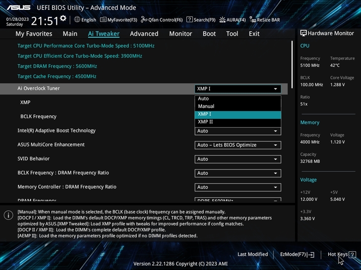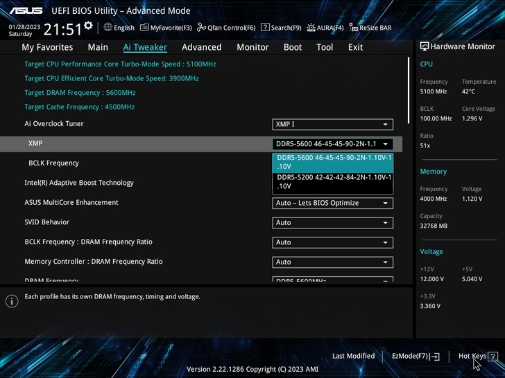 ▼開機後進入 ASUS PRIME Z790-P WIFI-CSM 的BIOS畫面,玩家們可以將記憶體設定在 XMP I(5600 C46-45-45-90-2N-1.10V-1.10V) 或是 XMP II 5200 C42-42-42-84-2N-1.10V-1.10V。