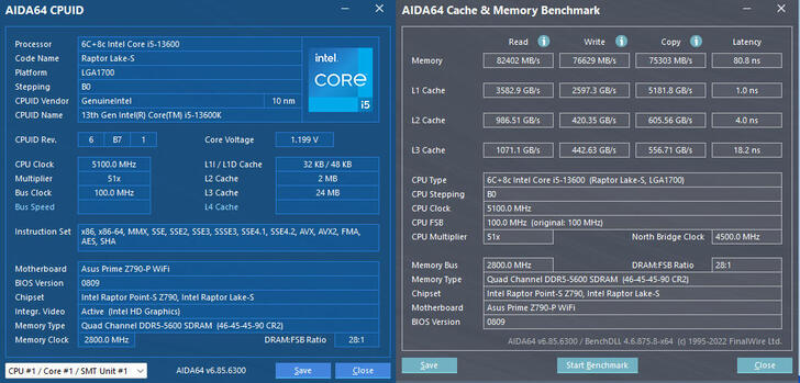 ▼AIDA64 Cache & Memory Benchmark 中,讀取 82402 MB/s,寫入 76629 MB/s,複製 75303 MB/s,延遲 80.8 ns。