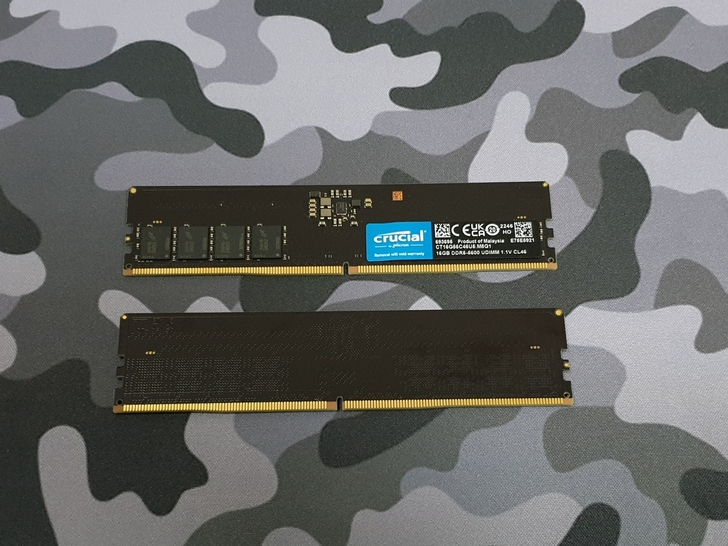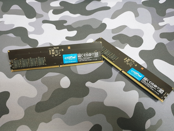 ▼Crucial DDR5-5600 32GB kit記憶體一覽,正面為每一顆都是單顆2GB的記憶體,反面則無記憶體顆粒。
