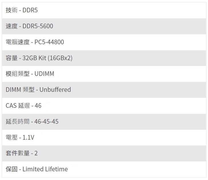 ▼外盒材質採透明塑膠包裝,外盒包裝正面,清楚標示出 DDR5-5600 32GB kit,由16GB兩支組成,工作電壓為1.1V,時序 CL=46,支援 Intel XMP3.0 與 AMD EXPO 技術。