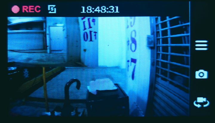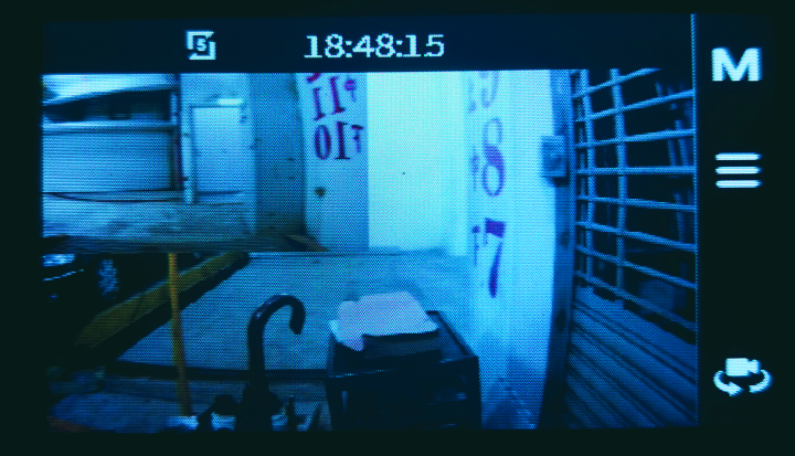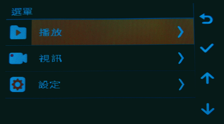 > 在一般畫面:上二個按鍵分別為視訊回放、選單,最下一個鍵為鏡頭切換顯示。