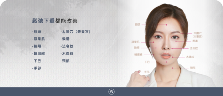 AestheFill®艾麗斯適合用於全臉雕塑治療,包括額頭、 蘋果肌、 臉頰、 輪廓線、 下巴、手部、 太陽穴(夫妻宮)、 淚溝、 法令紋、木偶紋、 頸部,鬆弛下垂都能改善,也可應用於頸部與手部紋路的改善
