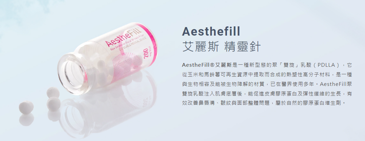 AestheFill®艾麗斯是一種新型態的聚「雙旋」乳酸(PDLLA),是從玉米和馬鈴薯可再生資源中提取而合成的熱塑性高分子材料,是一種與生物相容及能被生物降解的材質,已在醫界使用多年。AestheFill聚雙旋乳酸注入肌膚底層後,能促進皮膚膠原蛋白及彈性纖維的生長,能有效改善鼻唇溝、皺紋與面部整體問題,屬於自然的膠原蛋白增生劑。