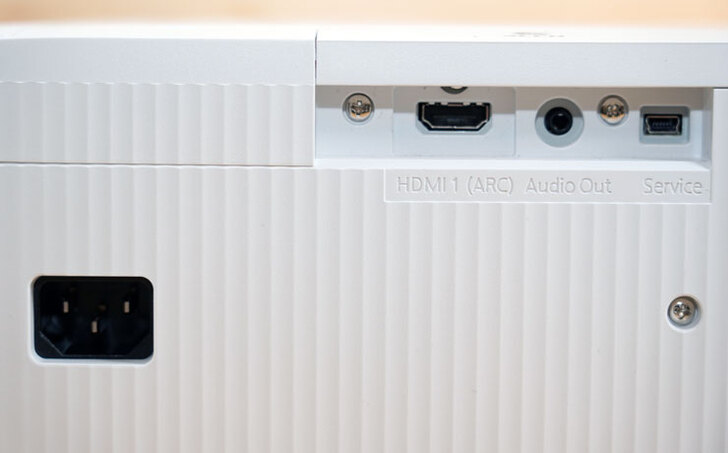 包括左側的電源接口與右上角的 HDMI(支援 ARC 雙向音訊回傳) 、音源輸出與一組檢修用的 mini USB 埠。