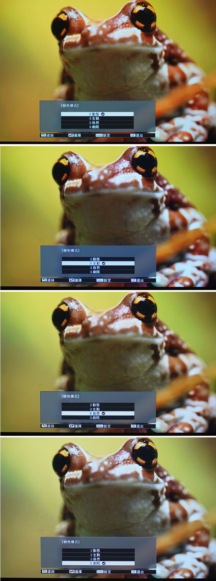 影像的顏色模式提供動態、生動、自然、劇院四種模式,由上而下可看出呈現上的差異表現。