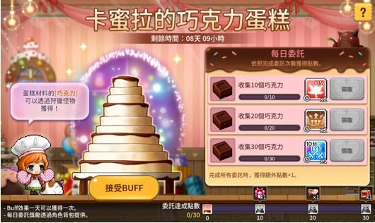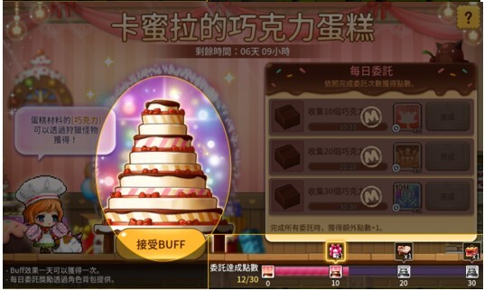 消滅怪物獲得巧克力並協助製作蛋糕吧!每天都會提供香甜的Buff和獎勵!
