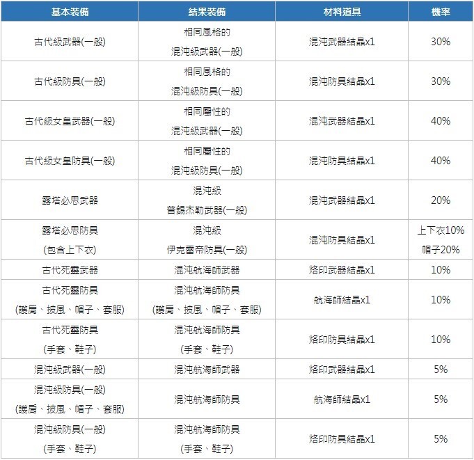 - 用混沌一般裝備可以製作混沌航海師裝備。