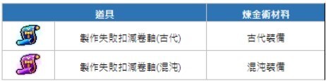 - 扣除古代裝備(包含死靈)的製作失敗時,需要「製作失敗扣減卷軸(古代)」。