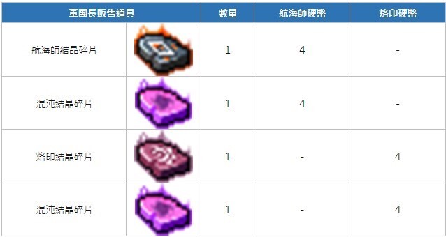 - 混沌結晶碎片:透過航海師硬幣、烙印硬幣可以購買、透過軍團長每週獎勵可獲得。