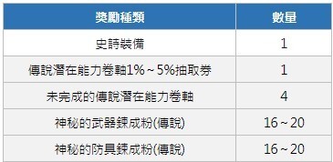 - 獎勵:裝備、傳說潛在能力卷軸1~5%抽取券、未完成的傳說潛在能力卷軸、鍊成粉