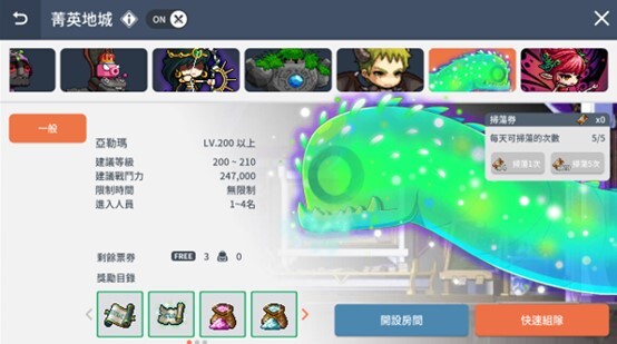 - 帳號內完成1次楓葉英雄Act.5的Lv.200以上角色可以入場。