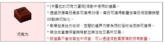 為了製作巧克力蛋糕需要[巧克力]!活動期間在戰場消滅怪物時,每日最多可獲得[巧克力]30個。(角色等級低於17等以下等級的怪物不會掉落道具。)
