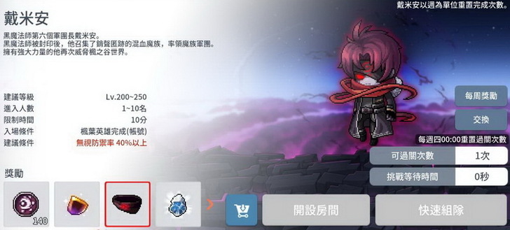 軍團長戴米安的入場條件是完成史詩篇章楓葉英雄(Lv160),且角色等級Lv200以上