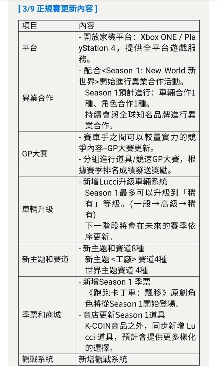 3/9維修後,S1正規賽就要開始啦,除了手機外還有開放家機平台,除了全平台一同遊玩競技之外,還有異業合作、車輛升級、GP大賽,和新增賽道等觀戰系統核心玩法的增加,相信之前玩過賽季的人應該不陌生而且會蠻期待的!