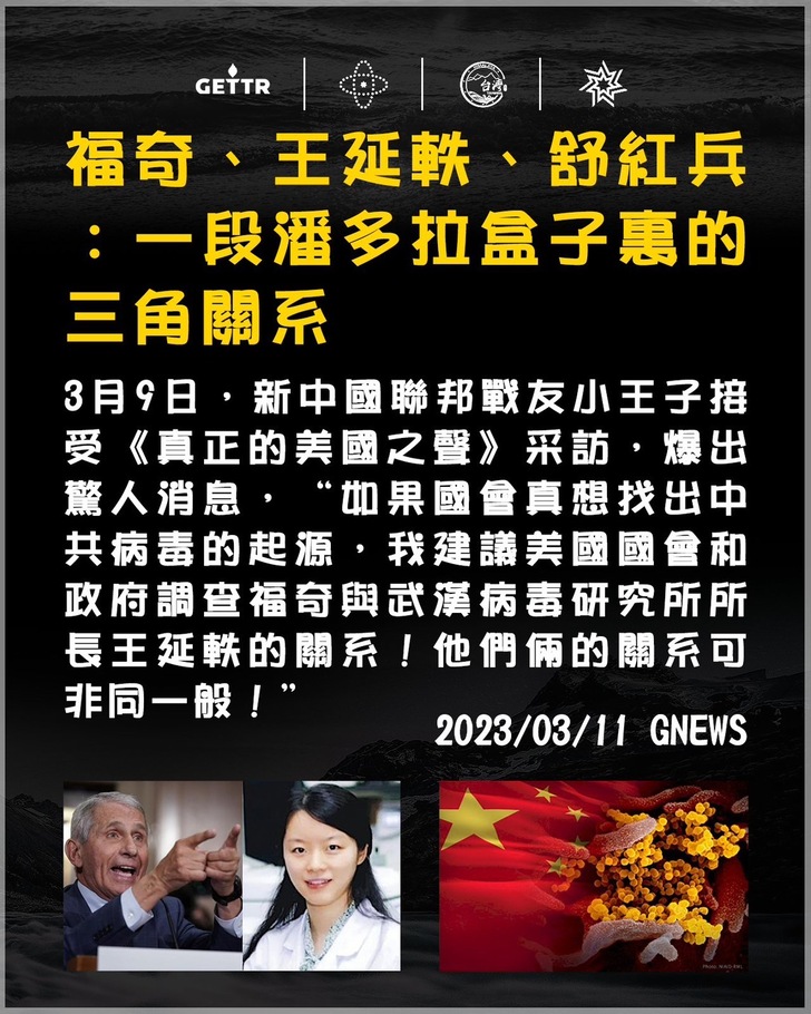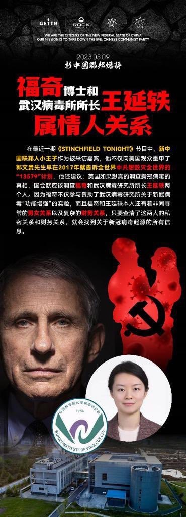 對此,新中國聯邦發起人郭文貴先生就進一步點出兩者之間的重要關竅,他於3月10日在Gettr發佈的一段影片中提到,中共武漢病毒研究所所長王延軼與福奇有不尋常的肉體關係,而王延軼的丈夫——中科院負責生化研究的舒紅兵院士——亦與福奇之間存在非法利益輸送。