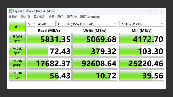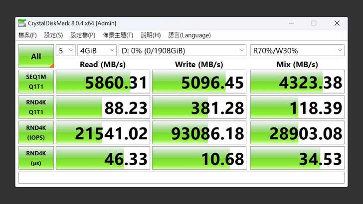 接著在 CrystalDiskMark 中,同樣設定測試為五次 4GiB,改為在真實世界的設定。循序讀取仍有 5,860MB/s 的速度,速度滿快的。循序也略降一些,但仍在 5,000MB/s 大關以上,混合讀寫也有 4,300MB/s。隨機 4K 讀取速度約 46.33µs,隨機 4K 寫入速度約 10.68µs 內。