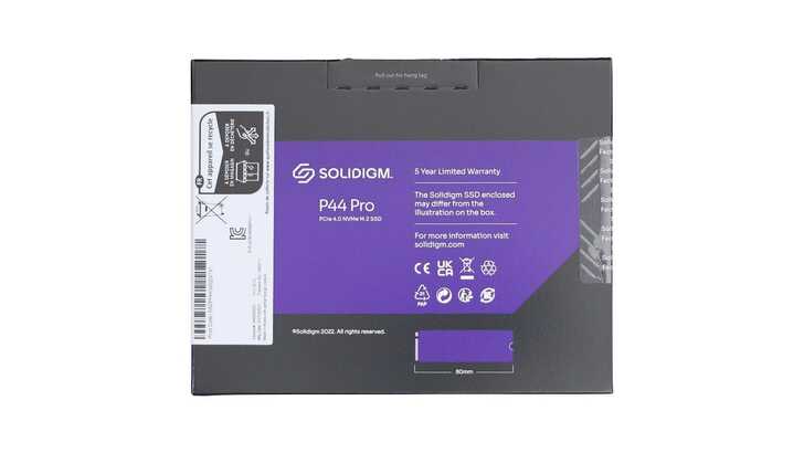 外盒以黑色為底,大量使用紫色搭配。中間是 SSD 本體的放大圖片,盒裝左上角有品牌 Solidigm Logo,左下角有 P44 Pro 名稱,以及 PCIe 4.0 NVMe M.2 SSD 標示。容量部分以貼紙標示出 2TB 及 Up to 7,000MB/s。