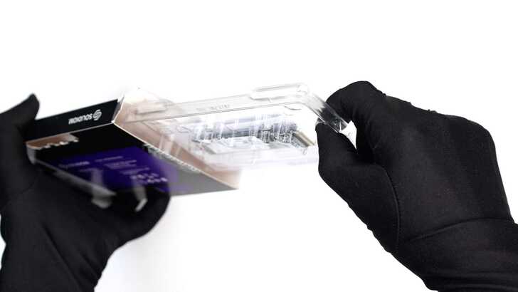 採用單面顆粒的佈局,正面有標籤貼紙。黑色的標籤貼紙中間有一條紫色線條,上面除了品牌和產品名稱,並沒有說移除會影響保固。實際撕下貼紙,也算好撕,沒有留下殘膠,對於之後安裝上主機板、使用主機板一體式散熱片會比較方便。