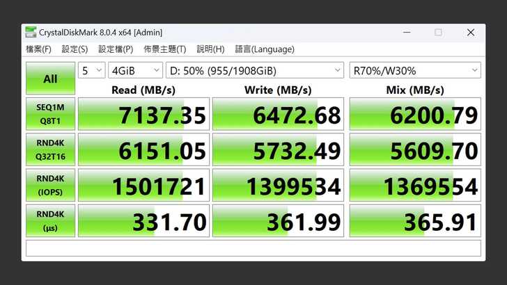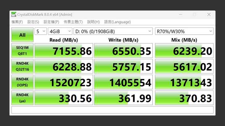 首先在 CrystalDiskMark 中,設定測試為五次 4GiB。最佳效能的設定下,循序讀取速度超過 7,000MB/s 大關,來到 7,155MB/s。循序寫入也表現很好,達到 6,550MB/s。混合效能也不錯,約 6,239MB/s。雖然官方沒有標示,但是隨機 4K 不管是讀取還是寫入都很優異,屬於消費級產品第一梯隊。實測得到讀取約 1,500K IOPS,隨機 4K 寫入 1,400K IOPS。