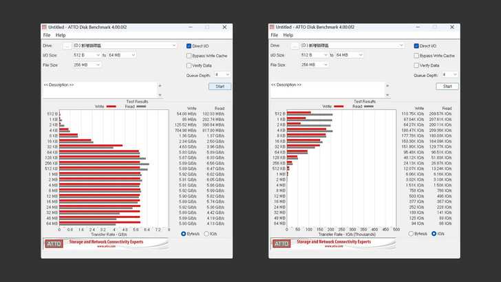 在 ATTO Disk Benchmark 中,讀取和寫入都落在 6.00 GB/s 左右。讀取在 256KB 達到巔峰,16MB 以上有下降趨勢,寫入則是在 32KB 時開始降低。4K 大小寫入為 180.47K IOPS,讀取為 209.36K IOPS。