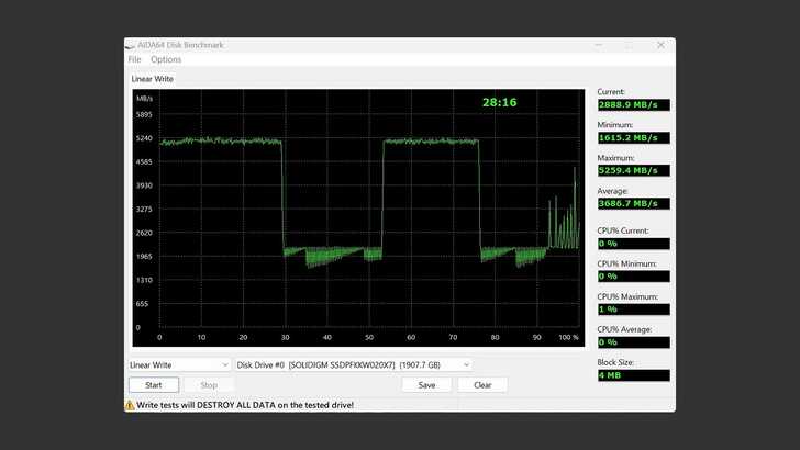 在 AIDA64 Disk Benchmark 中的 Linear Write。一開始寫入速度都在 5,000MB/s 以上,大概在 30% 時下降到 1,500~2,200MB/s 之間浮動,之後再滿速跑一段,後面再降速。最終得到平均為 3,686.7MB/s,與前段班成績差不多。