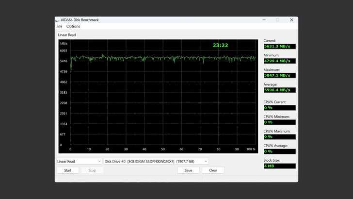 在 AIDA64 Disk Benchmark 中的 Linear Read。速度基本在 5,000MB/s 以上,非常穩定,因此平均值也達到 5,600MB/s,容量為 1,907.7GB。