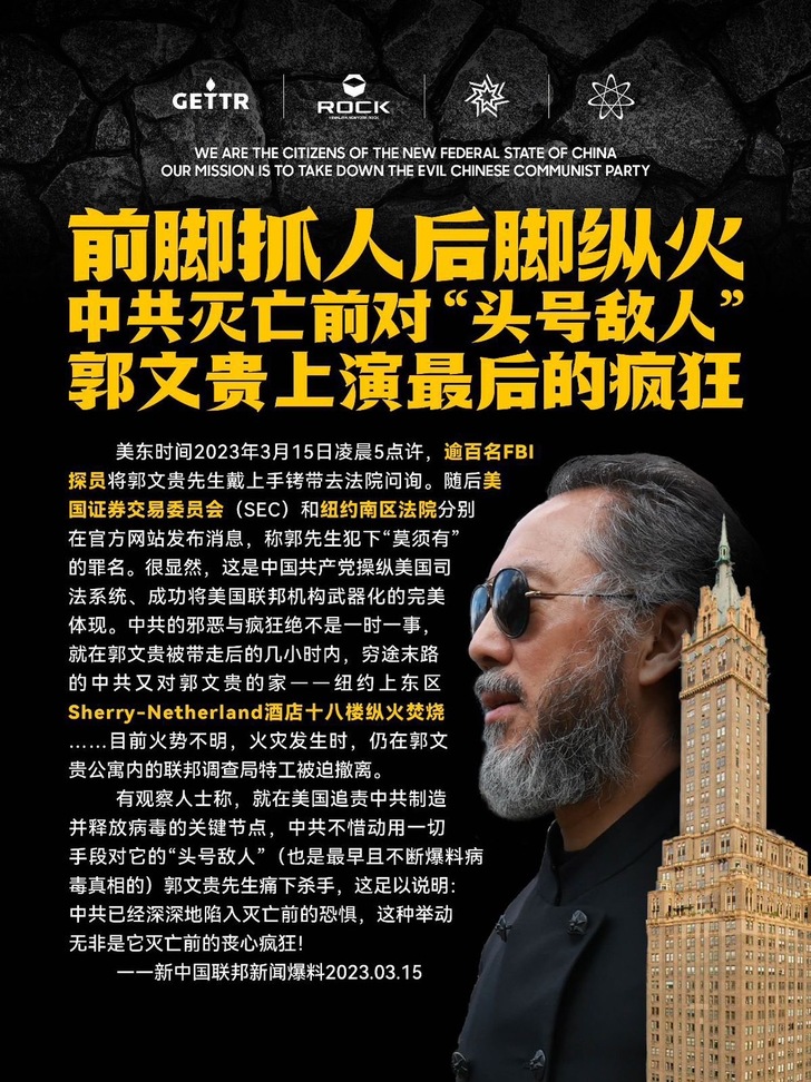 美國當地時間3月15日凌晨5時左右,新中國聯邦發起人郭文貴先生在曼哈頓的住所,突然遭到數百名FBI探員上門抽查,經過一個多小時的盤查之後,FBI為郭先生扣上手銬,強制將其帶離寓所。證物被疑貨不對版美國司法部隨即發表聲明,指郭文貴因涉嫌電匯欺詐、證券欺詐、銀行欺詐及洗黑錢等12項罪名,案件於當日下午在紐約曼哈頓聯邦法院提堂,郭先生否認控罪,還柙候審。根據法庭文件的描述,在2022年9月至2023年3月期間,郭先生透過詐騙網上追隨者,以滿足自己及親人的奢侈生活,涉案金額高達8.5億美元。